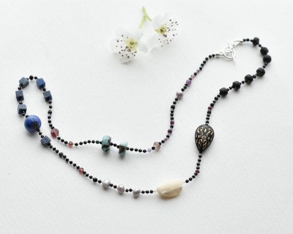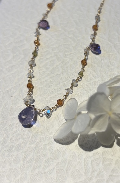 厳選した石や真珠を身体に馴染みやすいオールノットのネックレスや14kgfやsilver925などで加工しお持ちします。