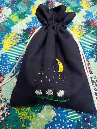 三日月と白い花巾着