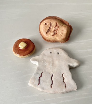 おばけのブローチ、たい焼きのブローチ、パンケーキのマグネット